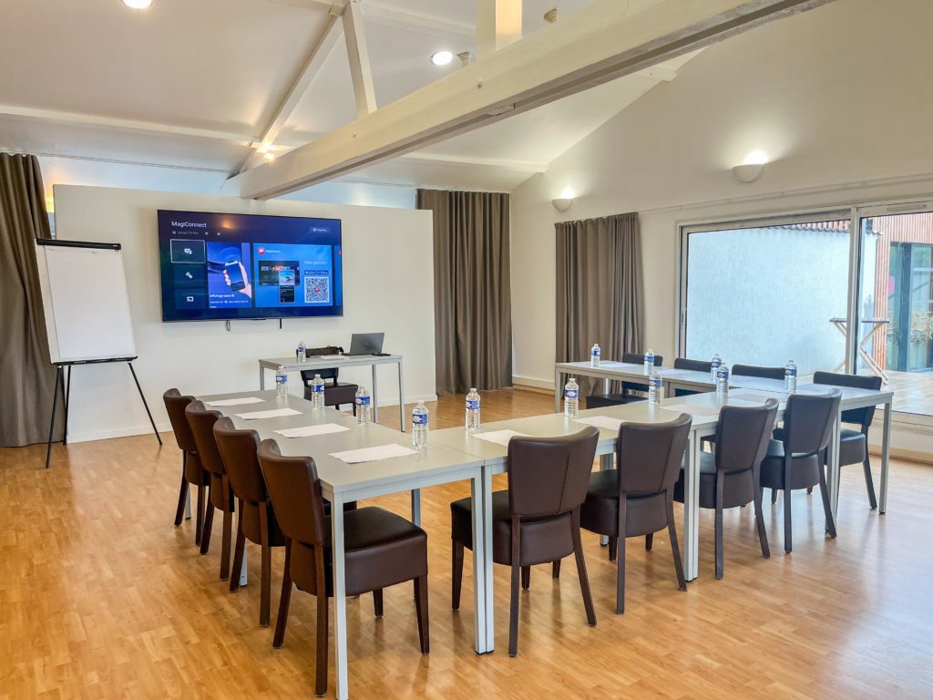 1 grande salle climatisée de 70m² pour 50 personnes théâtre et 24 personnes en formation classique en U, avec 2 balcons-terrasses offrant une vue panoramique sur le golf